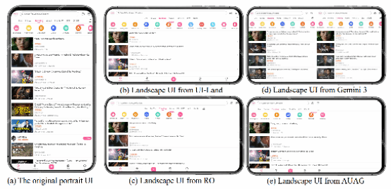 随着移动应用的普及,用户对不同使用场景下的界面(User Interface, UI)体验提出了更高要求,尤其是横屏模式在视频观看、多任务操作等场景中具有明显优势。然而,大量应用并未提供专门设计的横屏UI,在对289个主流应用的分析表明,仅有少数应用支持独立横屏界面,绝大多数仅通过拉伸竖屏UI或直接限制横屏使用,且约63.5%的横屏界面存在布局不合理、内容裁剪或交互不便等问题。其主要原因在于横屏UI开发成本较高(约增加30%),而现有自动化方法多依赖固定规则,难以生成高质量且可执行的代码。