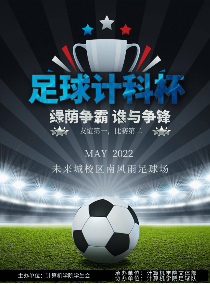 为鼓励广大同学合理学习、劳逸结合、走出宿舍,积极进行体育锻炼;同时也为了展现足球运动之美,推动黄色直播 足球运动的发展,进一步促进各班级、各年级间的交流与合作。黄色直播 将隆重举行第一届足球赛,整体赛事为积分制,每支队伍与其他所有球队循环竞赛。现将相关事项通知如下: