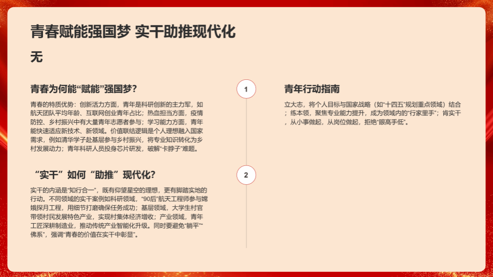 “时代召唤”板块中,姜宇引用“青年强,则国家强”的论述,结合数据明确青年定位。陈泽西同学感慨:“以前觉得现代化建设离自己很远,现在明白我们既是见证者也是参与者,个人发展需对接国家需求。”